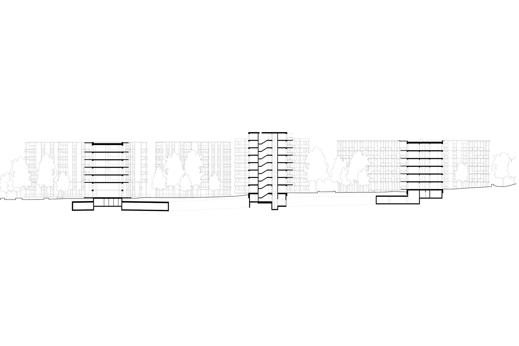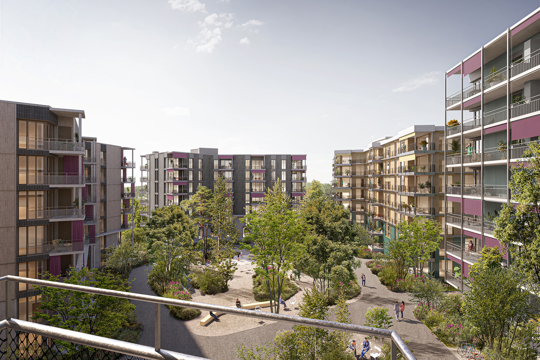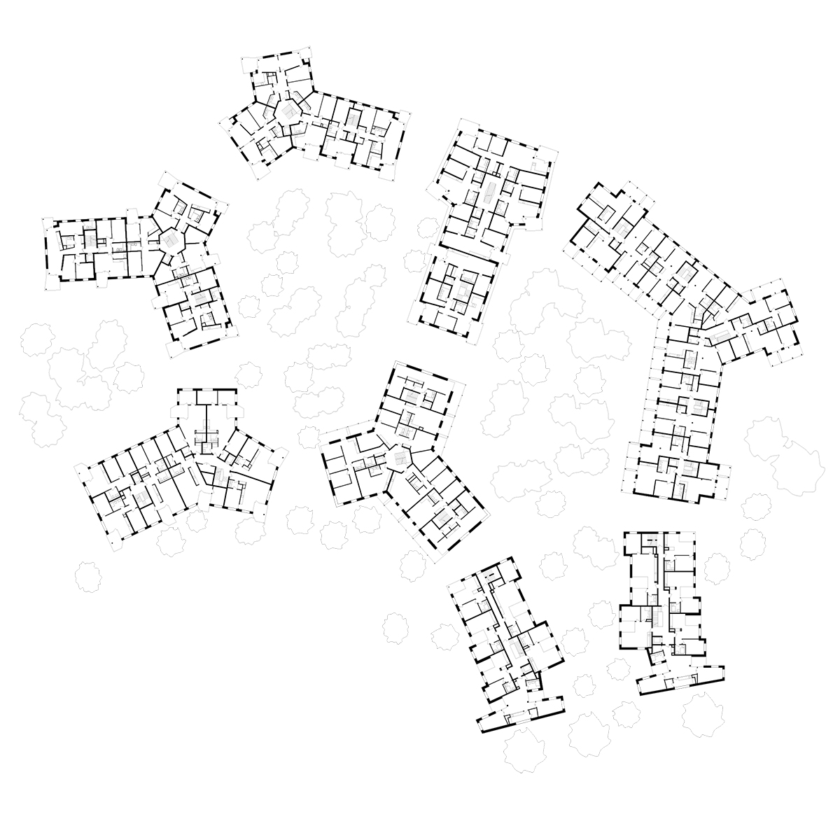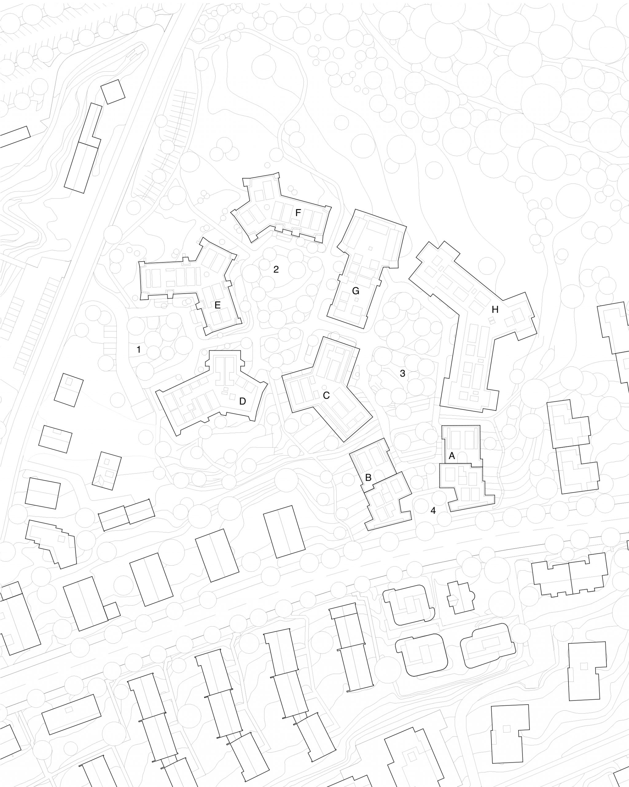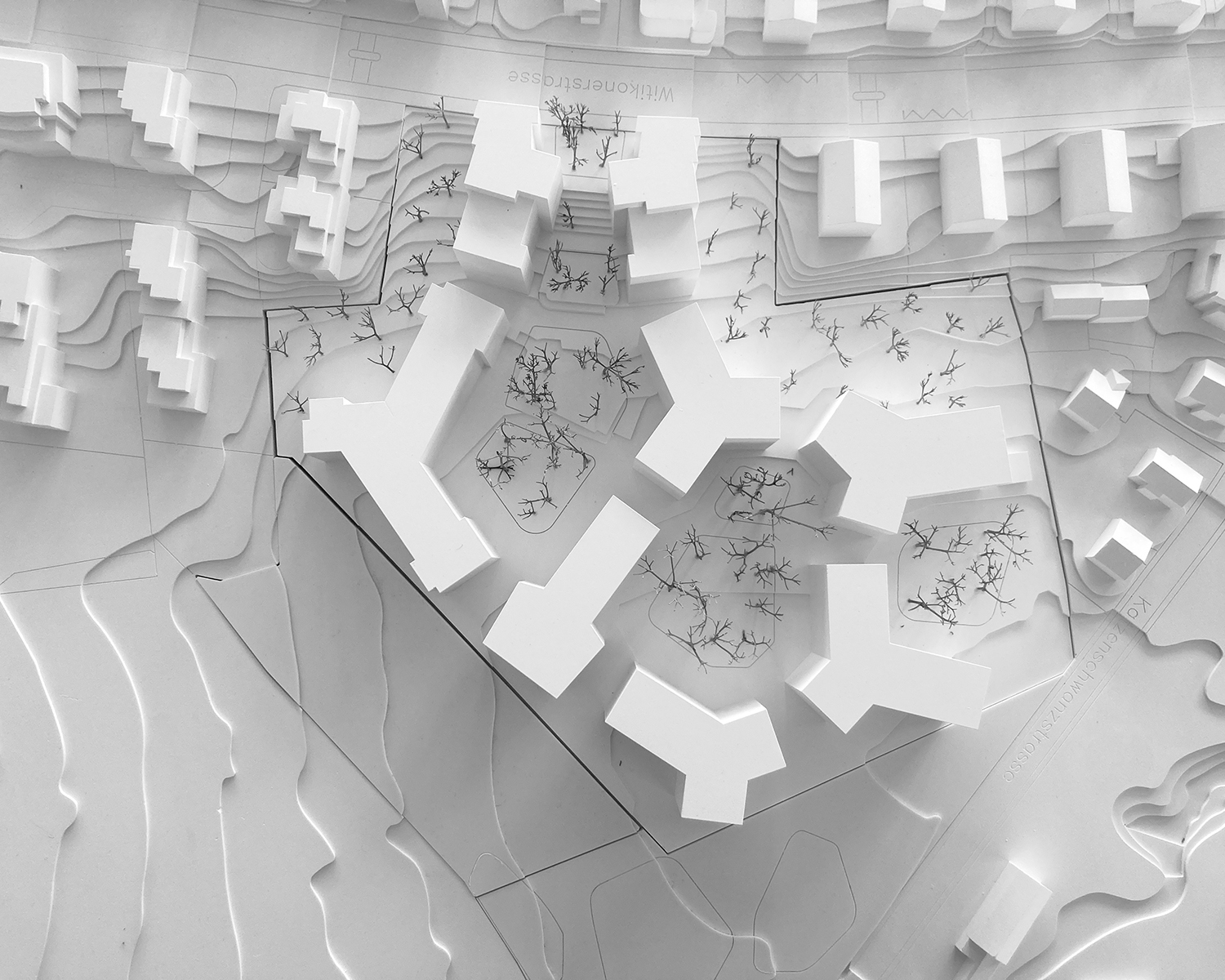 Das Areal Harsplen, mit einer Fläche von annähernd 25’000m2, am östlichen Rand von Witikon gelegen, bietet als letzte grosse Bauparzelle die einmalige Gelegenheit für eine städtebauliche Planung im grösseren Massstab, welche das Zuhause einer digitalisierten Gesellschaft sein wird. Die gesamte Überbauung umfasst 365 Wohnungen verschiedenster Grössen und Ausbaustandards, verteilt auf acht Baukörper. Diese unterschiedlichen Baukörper von fünf bis sieben Geschossen, deren Gemeinsamkeit in ihrer dreigliedrig aufgebauten architektonischen Ordnung liegt, schaffen im volumetrischen Zusammenspiel ihrer Hausflügel eine gesamtheitliche städtebauliche Figur, die identitätsstiftende Siedlungsfreiräume nach innen bildet und sich mittels räumlich öffnenden und verbindenden Freiräumen nach aussen zu ihrer unmittelbaren und weiteren Umgebung öffnet. Diese kollektive Mitte schafft eine neue, einzigartige Identität des Ortes, konserviert die typische Topografie der Landschaft und reiht sich andererseits durch ihre Massstäblichkeit harmonisch in das Bebauungsmuster von Witikon und in die landschaftlichen Dimensionen der Umgebung ein. Das Zentrum des Gartenhofs bildet eine grosszügige Spielwiese, umgeben von schattenspendenden Bäumen. Der Siedlungshof ist vielfältig für die unterschiedlichen Anspruchsgruppen der zukünftigen Bewohnerschaft bespielbar. Beide Platzräume werden von den angrenzenden öffentlichen und halböffentlichen Nutzungen der Gebäude geprägt. Darunter befinden sich Gewerberäume, Gemeinschaftsräumen, Kindergarten und Kinderkrippe, sowie die allgemeine Zufahrt in die Tiefgarage der Überbauung. Zudem sind beide Platzräume befahrbar und dienen der Ver- und Entsorgung des Areals. Ein Grossteil der Wohnungen profitiert von zwei- bis dreiseitigen Ausrichtungen sowohl zu den Innenhöfen wie auch zu den umliegenden Landschaftsräumen. Diese Raumverbindungen von öffentlichen und privaten Aussen- und Innenräumen schaffen ein ausgewogenes Verhältnis von Kommunikationsorten und privaten Rückzugszonen. Durch die gemeinsame Entwicklung von unterschiedlichen Wohnwelten und Typologien über die einzelnen Gebäudebetrachtungen hinweg koordiniert, entsteht ein attraktives Ensemble an Wohnraum für ganz unterschiedliche Anspruchsgruppen aller Alters- und Bevölkerungsschichten.